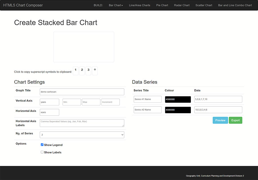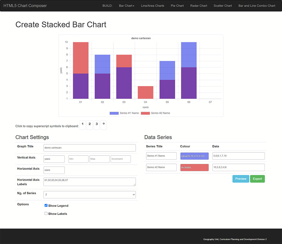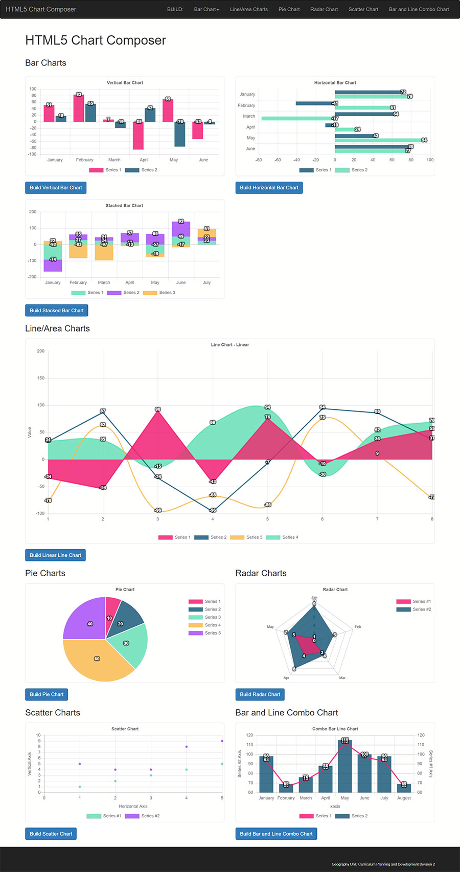 A common element used across their content is the need to compose HTML5 Charts for learning material. This application allows them to compose HTML5 Charts by entering the various parameters, export it into the appropriate format to deploy onto their platform
